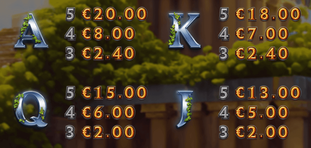The low-paying icons are J, Q, K and A playing cards. The high-value symbols are the ring, the chalice, the goddess Hera and the god Zeus.